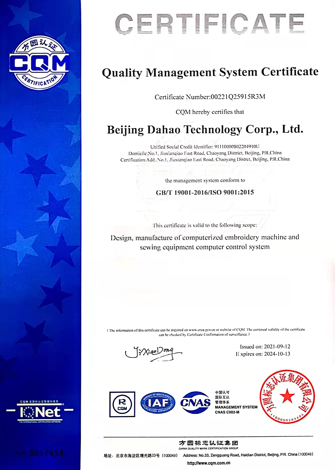 公司拥有一支技术过硬、经验丰富的技术研发人才队伍,团队人数超400名,其中博士及硕士超60名。公司中拥有中高级技术职称科技人员总数占到公司总人数的20%以上;其中包括获国家科技进步二等奖5人,被授予北京市、轻工联合会劳动模范5人,首都劳动奖章4人,享受国务院政府津贴3人,研发团队和个人被评为“北京市有突出贡献的中青年科技专家”、“轻工业科技创新先进集体”、“中国缝制机械行业创新团队奖”等称号。