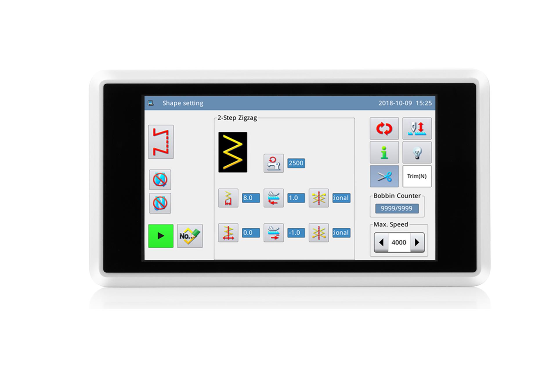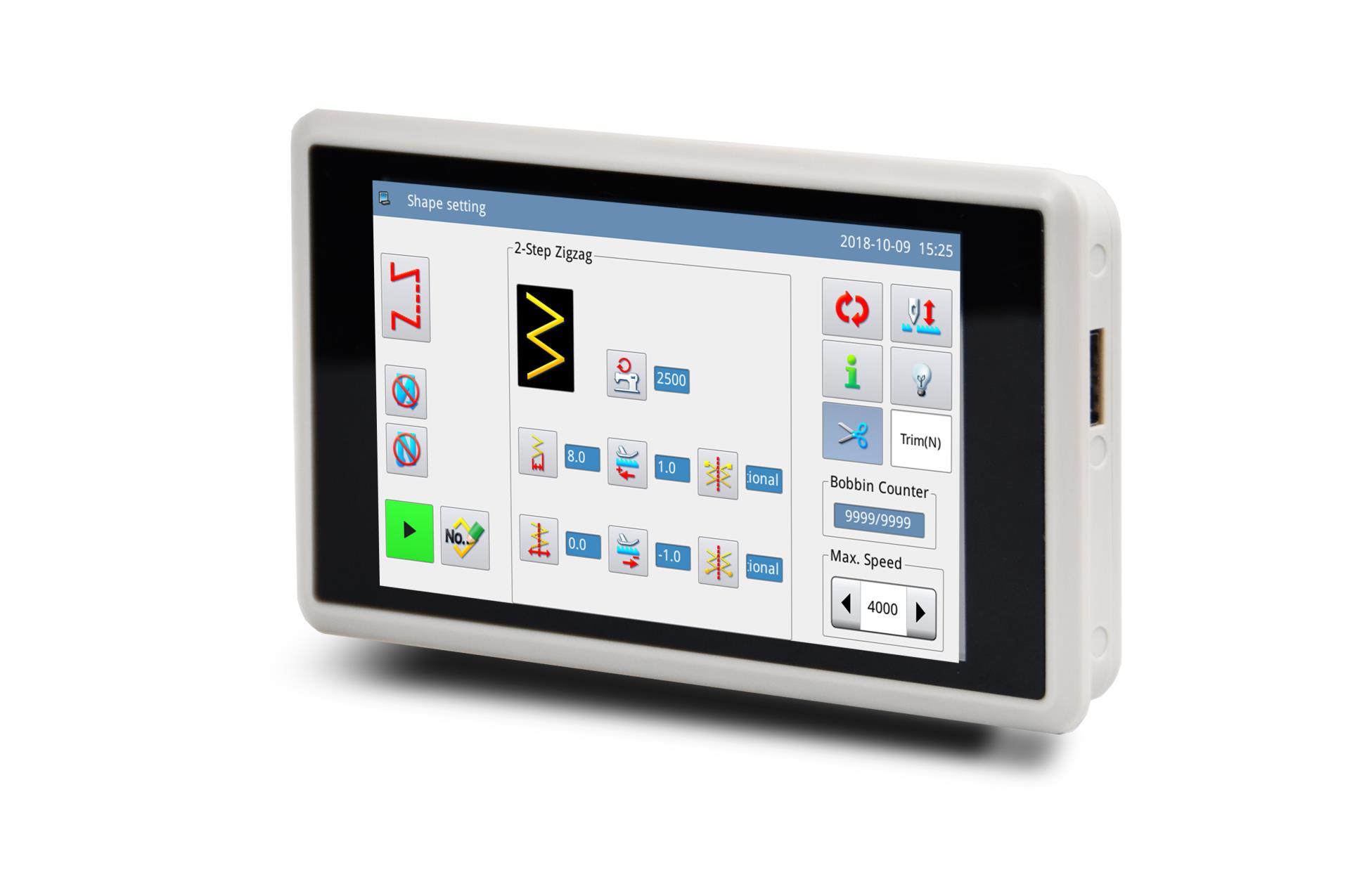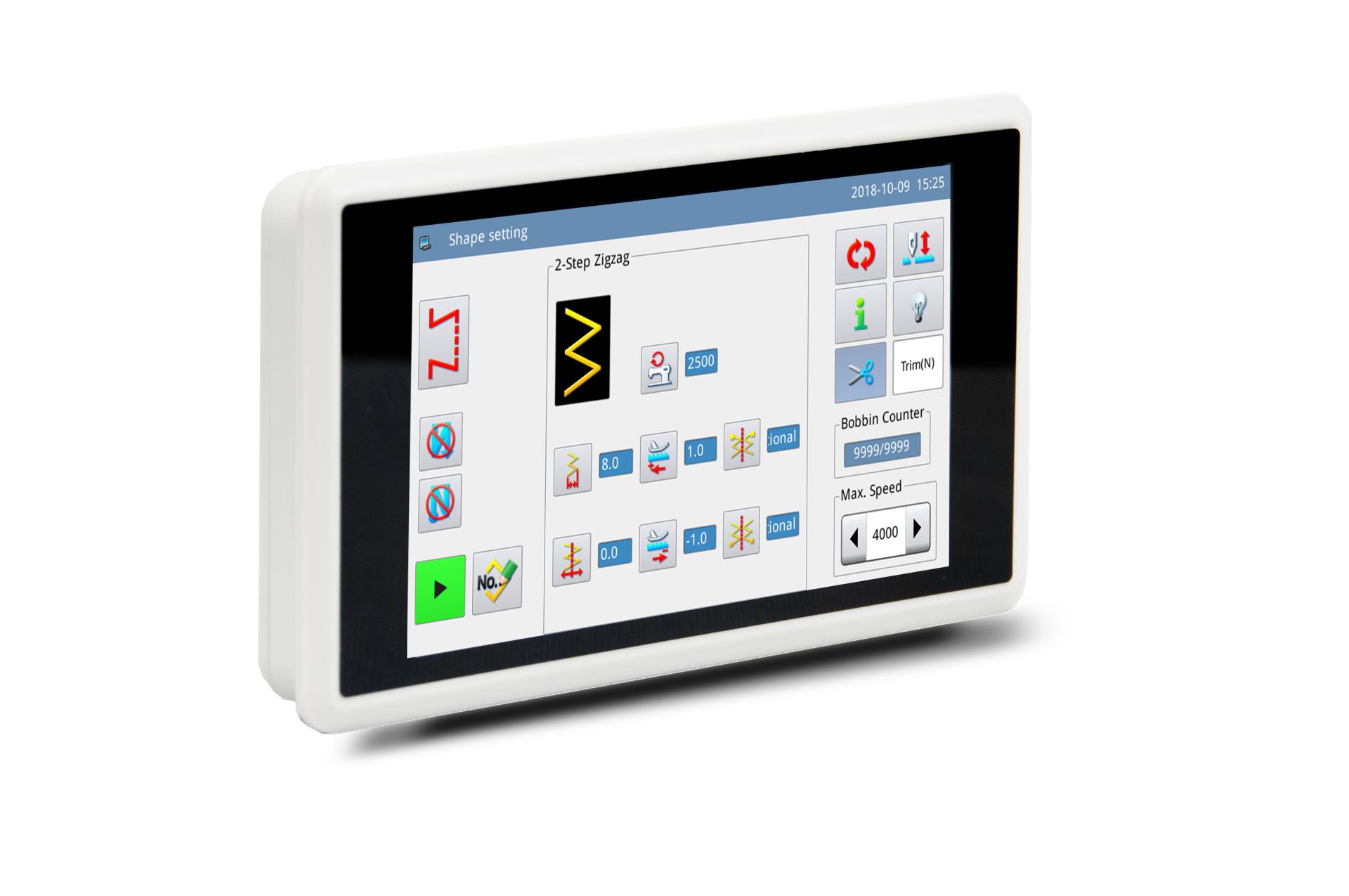 多种操作面板可供用户选择,分别为10 英寸/7 英寸/5 英寸真彩液晶触摸屏面板,点阵液晶面板,数码管按键面板,满足高中低档各种机型操作特点的需求。提供花样数据输入输出接口,使用通用USB 接口方式。同时可根据客户的特殊需求定制个性化操作面板的设计方案。操作面板采用图形加多语言注解方式具有高度的可读性,对于初次使用电脑缝纫用户来说非常容易上手,具有优秀的界面友好度。