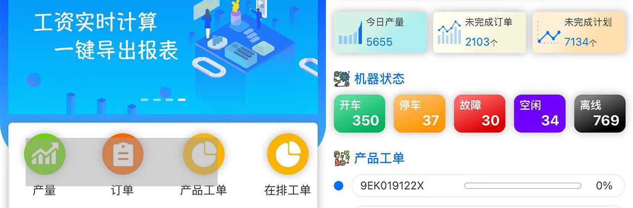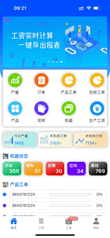登录账户权限下的所有功能入口,查看产量、订单、计划的统计信息,查看机器运行状态。查看最近工单和订单的生产进度。