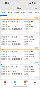 分类查看不同状态订单的生产进度及其他基本信息,详情中可进一步查看订单、订单产品、设备工单、工艺单的详细信息。