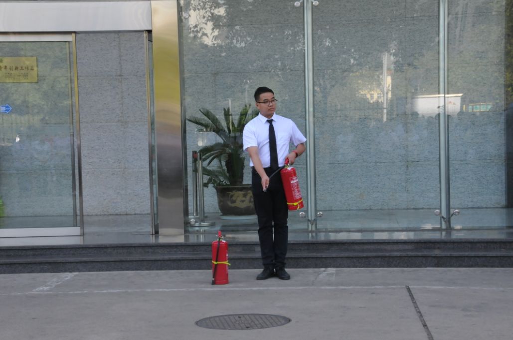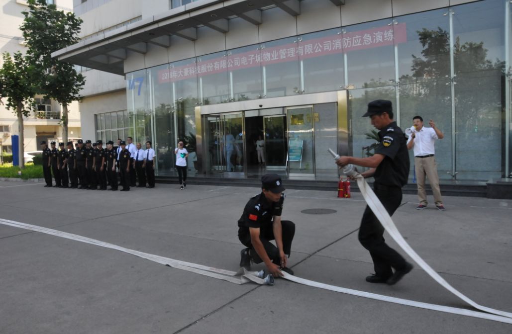 员工从大楼内疏散完毕并到安全区域集合。中关村电子城产业园物业公司兼职消防员向员工们讲授了灭火器的正确使用方法,并现场演示了消防水带的连接方法。员工代表主动上前按照刚才演示的方法操作灭火器。