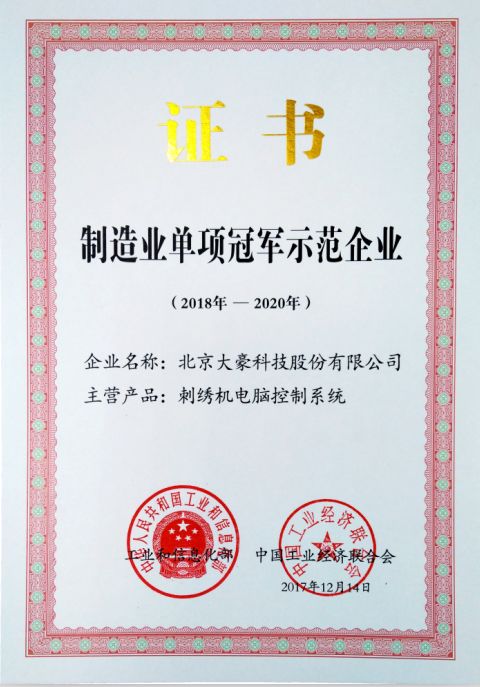 大豪科技拥有电脑刺绣机电控、特种工业缝纫机电控、袜机电控等多项行业龙头产品,在缝制针纺机械电控领域市场占有率连续多年在国内外位居前列。特别是电脑刺绣机控制系统随整机销往遍布全球100多个国家和地区。这次被认定为“制造业单项冠军示范企业”是对大豪科技在缝制机械电控领域行业地位的充分认可。