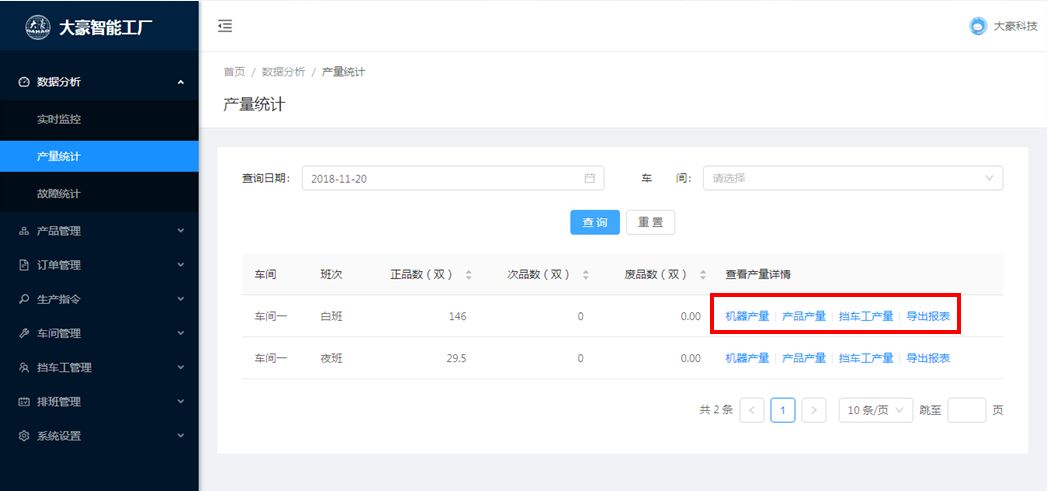 可按日期班次查询车间、产品、机器、挡车工产量详情;