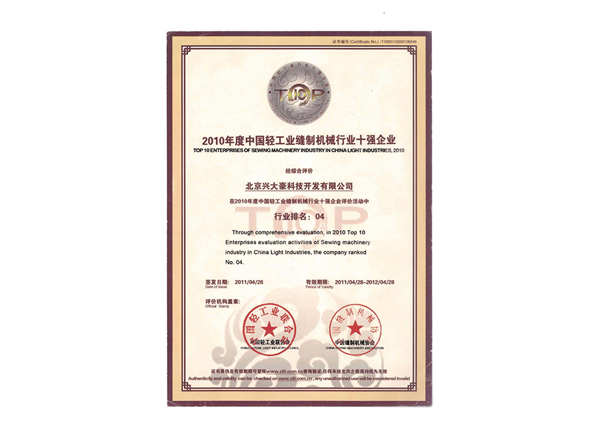• 2010轻工业缝制机械行业十强