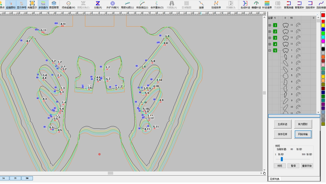屏幕上的质量保证威尔克姆大豪e4.5提供了很多工具,这些工具可以优化刺绣设计,重新审视回看花样,并最终产出更优的机器刺绣文件。这里我们介绍一个运针工具栏运针工具栏让我们可以逐步审视一个完整花样,来优化刺绣顺序。有对象运针、分段、颜色运针、功能码运针、剪线运针或者按针数运针等。运针可以从任意针迹开始,点击鼠标左右键可以实现在花样中前进或者后退。开天眼!打开“显示连接线”和“显示功能”按钮激活展示连接线